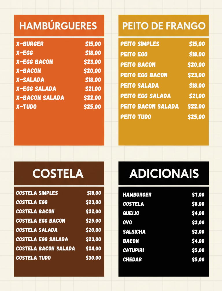 Nosso cardápio oferece hambúrguer artesanal, peito de frango grelhado, filé macio, calabresa suculenta, pernil suíno temperado e o clássico cachorro-quente caprichado — tudo feito com carinho e atenção aos detalhes.